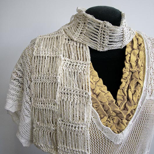 You will find in my shop one-of-a-kind and limited edition accessories. You could discover the perfect little purse for that special event, a lovely wrap to wear to the ballroom or to the beach, a dramatic scarf out of handspun yarn, a daintier scarf out of clusters of ultra-thin threads, a spunky hat, or some classic and warm winter accessories.